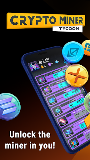 Start as a rookie miner and level up fast! Tap to mine your first virtual coins, upgrade your rigs, hire elite managers, and unlock high-tech zones inspired by futuristic crypto worlds.